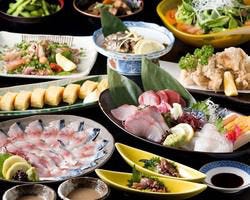 1.前菜3種盛り/2.おまかせサラダ/3.揚物/4.お刺身(5~6種)/5.名物サバの鉄引き(お刺身の盛合せに一緒に盛り込みます)/6.焼物/7.季節の一品/8.肉料理/9.酢の物/10.しめ(麺類またはご飯物)