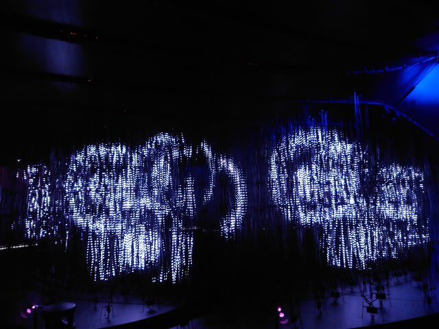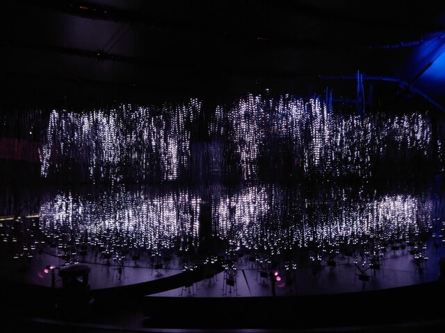 中に入ると、真っ暗な空間の真ん中に、32万球の光り輝くLEDライトが巨大な束のようになって配置されています。