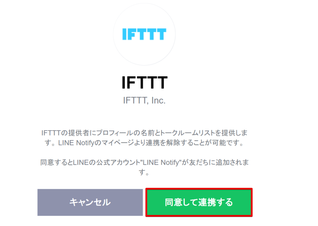 ログインすると、IFTTTとの連携同意画面が表示されます。「同意して連携する」をクリックします。