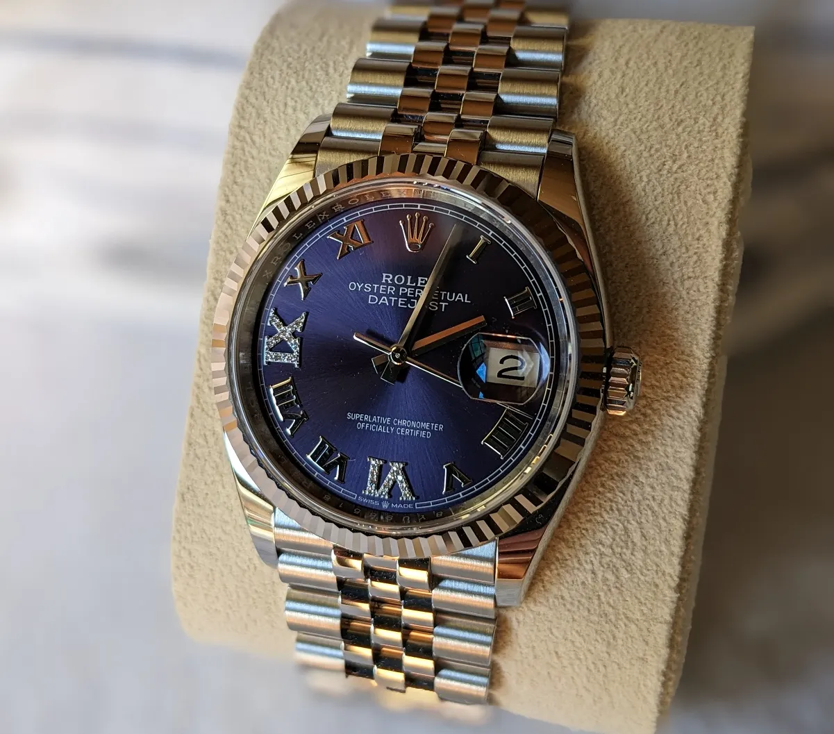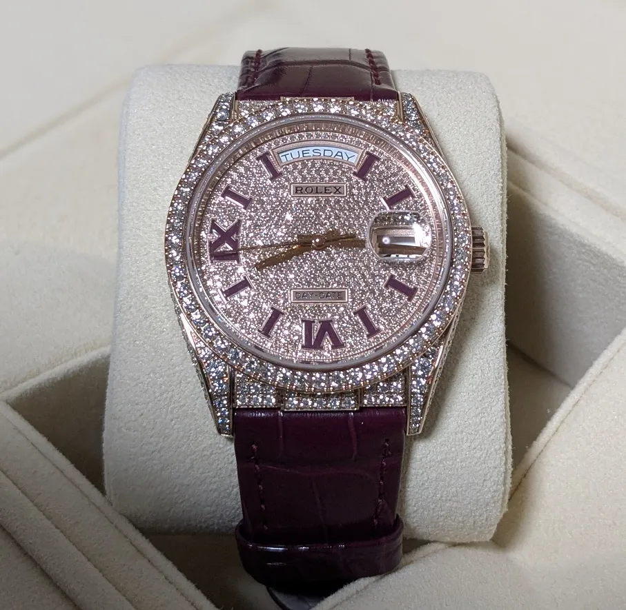 ロレックスが好んで用いる一般的な技法には、パヴェセッティングと呼ばれるものがあります。これは、表面に石を敷き詰める際に使用されます。この場合、使用される石は常にブリリアントカットのラウンドダイヤモンドで、3~5個の小さなビーズ状の金属の爪で固定されます。これは爪留めに似ていますが、爪留めはより大きな石に使用される傾向があり、爪が長く、石の露出が多くなります。また、ロレックスは、特にダイヤモンドのインデックスにクローズドセッティングを採用しています。さらに、チャネルセッティングまたはバゲットセッティングというのも用いられます。これは、通常、バゲットカットまたは台形カットの石と組み合わせて使用されます。この見事な技法は、間に金属を挟まずに、宝石の列を横に並べ、上下に折り畳まれた金の縁だけで石を固定します。もうよくわからないぐらい細かい技術です。