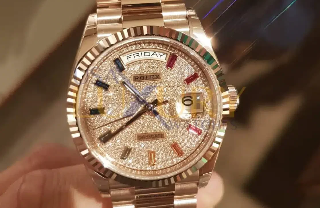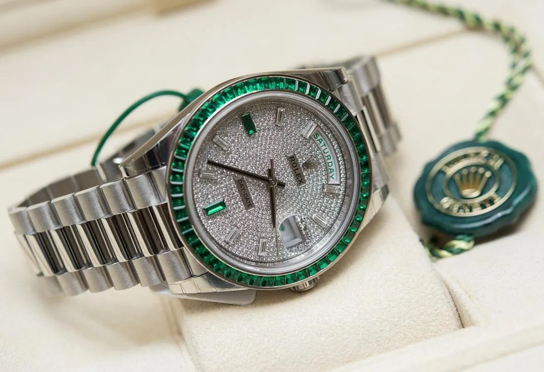 他に、目を見張るようなジェムセットのGMTマスターIIとしては、ブラックサファイアとダイヤモンドを配したSANR、ブルーサファイアとダイヤモンドのSAなどがあり、その多くは文字盤、ケース、ブレスレットにもダイヤモンドがびっしりと敷き詰められています。エメラルドをセットしたモデルは非常に稀少で、台形カットのエメラルドとバゲットカットのダイヤモンドとエメラルドのインデックスを備え、文字盤全体にダイヤモンドを敷き詰めたデイデイト40のような時計にエメラルドを使用することで知られています。