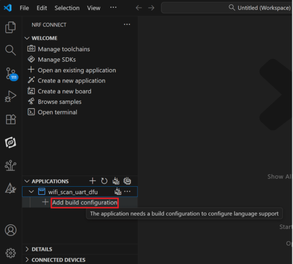 Step 4: Enter application location: C:\ncs\v3.1.1\raytac and name the project as: wifi_scan_uart_dfu