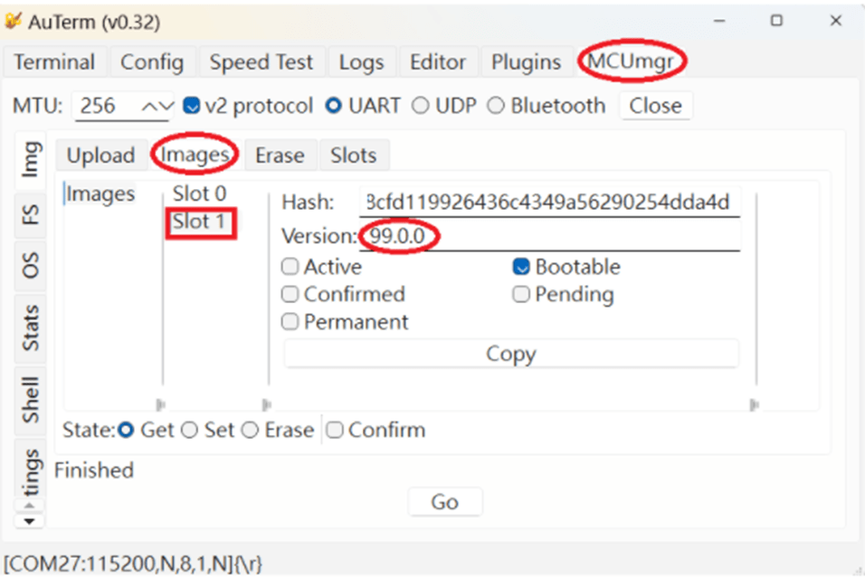 It also indicates Image version: 99.0.0 in MCUmgr-Slot 0.