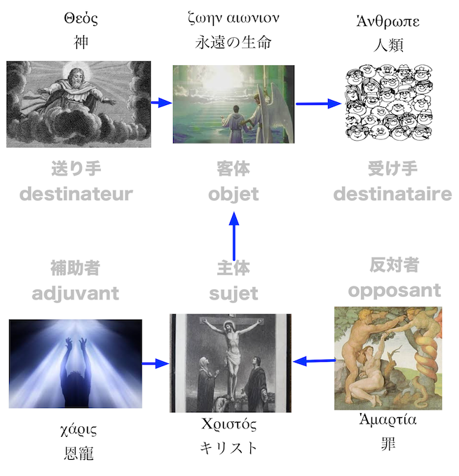 「主体」である〈キリスト〉は、「送り手」である〈神〉にかわって、「受け手」である〈人類〉に、「対象」である〈永遠の生命〉を授ける。