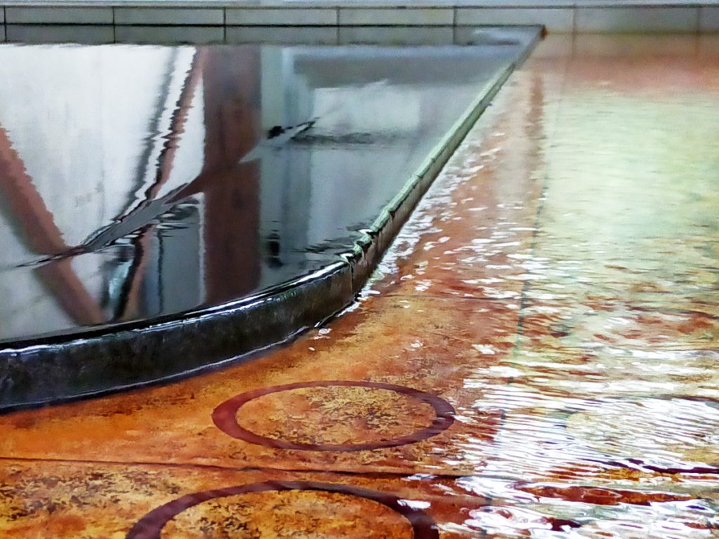 もうひとつの源泉、丸美ヶ丘2号泉は、大浴場の小さな浴槽(浴槽②④)で使用しています。こちらの浴槽はいわゆる不感温度と言われるほぼ体温と同じ温度のぬる湯です。更に源泉に多くの気体を含んでいるため、炭酸泉のように体中に気泡が纏わりつきます。このように気体を含む温泉は新鮮である証でもあります。