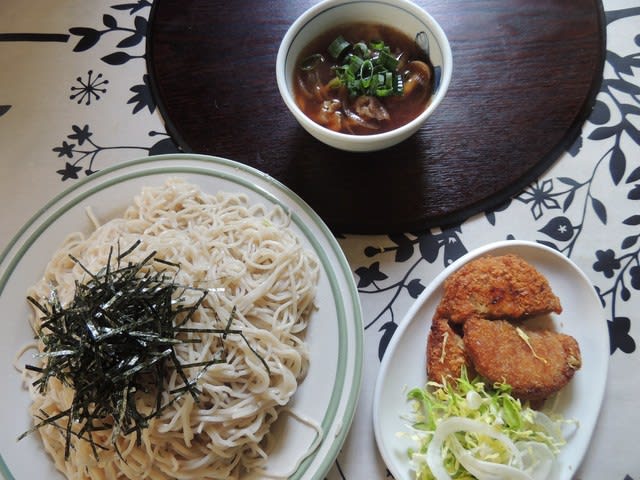 お昼は ざるそば と コロッケ