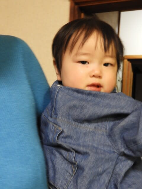 お兄ちゃん孫 ピースって言ったら 毛布の上でしています(笑)
