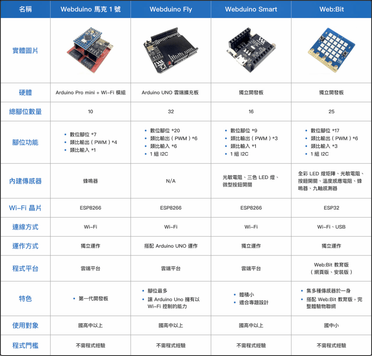 關於 Webduino 開發板的不同規格特色可以參考下方表格。