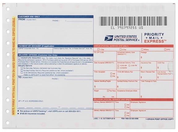 Here is the Priority Mail Express envelope and label (Priority Express Mail = Blue):