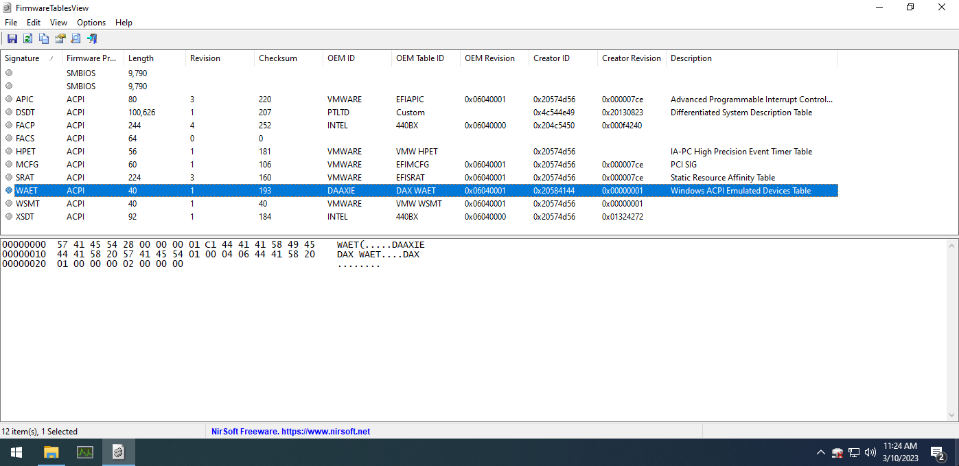 After installing the most popular virtualization applications (Hyper-V, VirtualBox, Parallels, etc.), It was easy to see they all had specific OEMIDs (as well as OEM Table IDs and Creator IDs) that indicated what the hosting tool was. You may have noticed several things, like the number of tables being significantly less and a specific table appearing on all these platforms — WAET.
