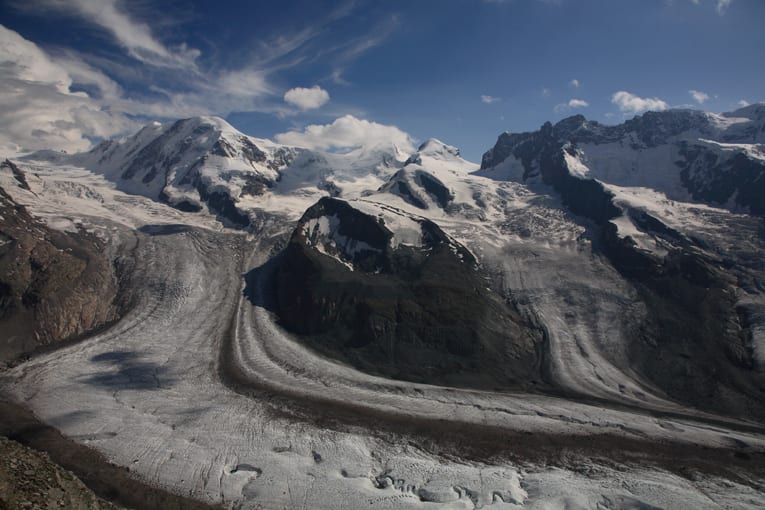 景色の良さの点で言えば、ユングフラウヨッホのあるベルナーオーバーラントよりも上かもしれない。ハイキングのバリエーションの多さについても同様だろう。体力が許せばの話だが、写真の下に写っている氷河まで徒歩で降りることは可能である。