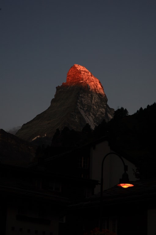 ツェルマットの町から見た、マッターホルンの朝焼け。