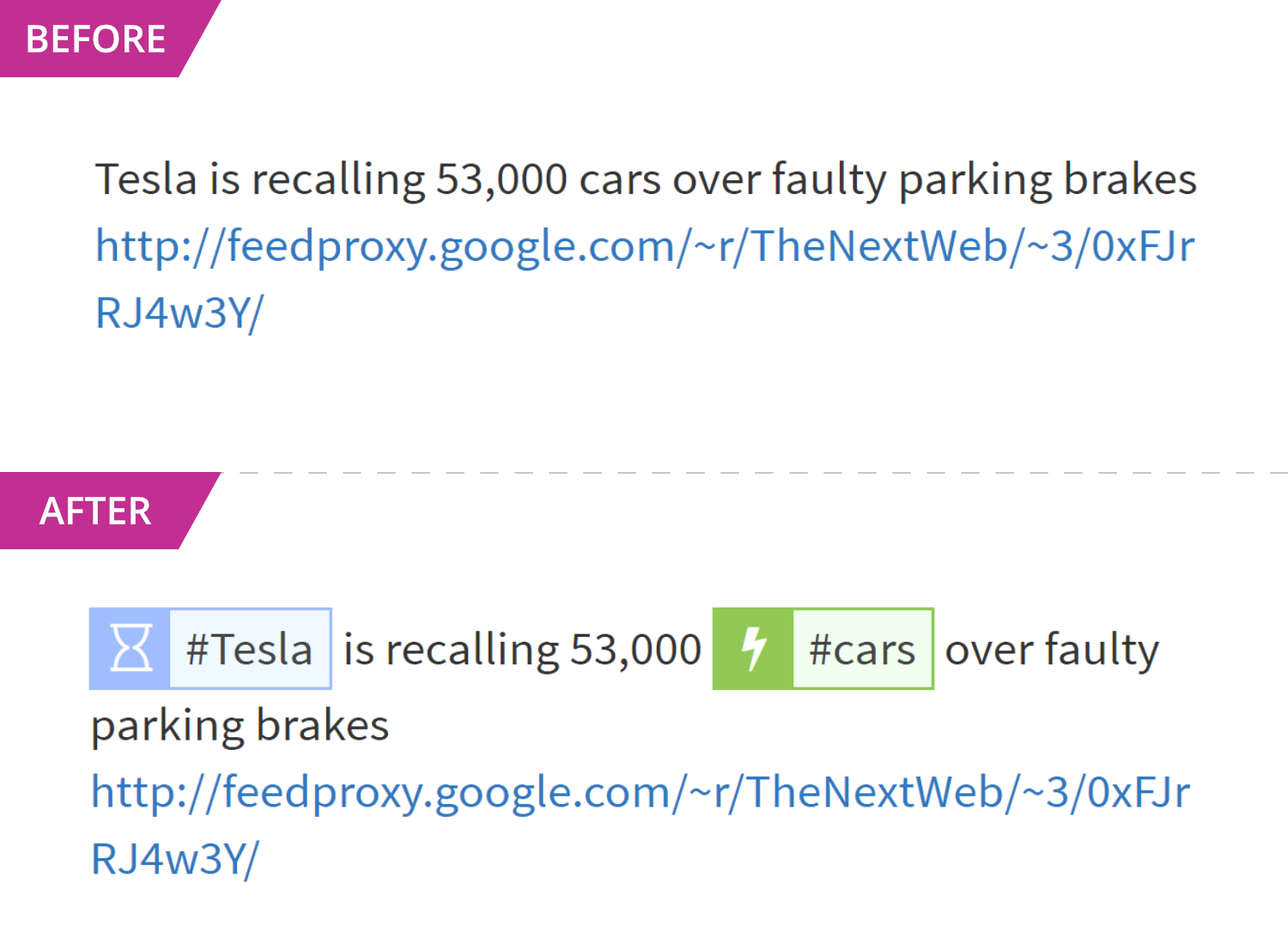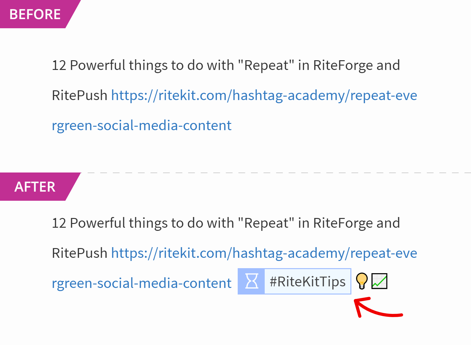 Automatically replace words with emoji or hashtags. Perfect for adding an emoji to certain words, creating hashtags from brand names and removing unwanted parts of the post.