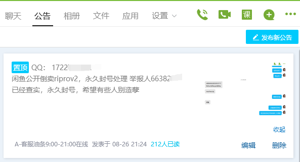 8-24号有人咨询反馈他的网站启用riprov2后无法正常运行,页面打不开502等问题,经过我查看后是盗版主题,这位用户说他是闲鱼买的,40元一个主题包带授权信息,经过我们排查,已经封号处理并且在群公告公开封号结果。 以下为盗版截图,切勿相信