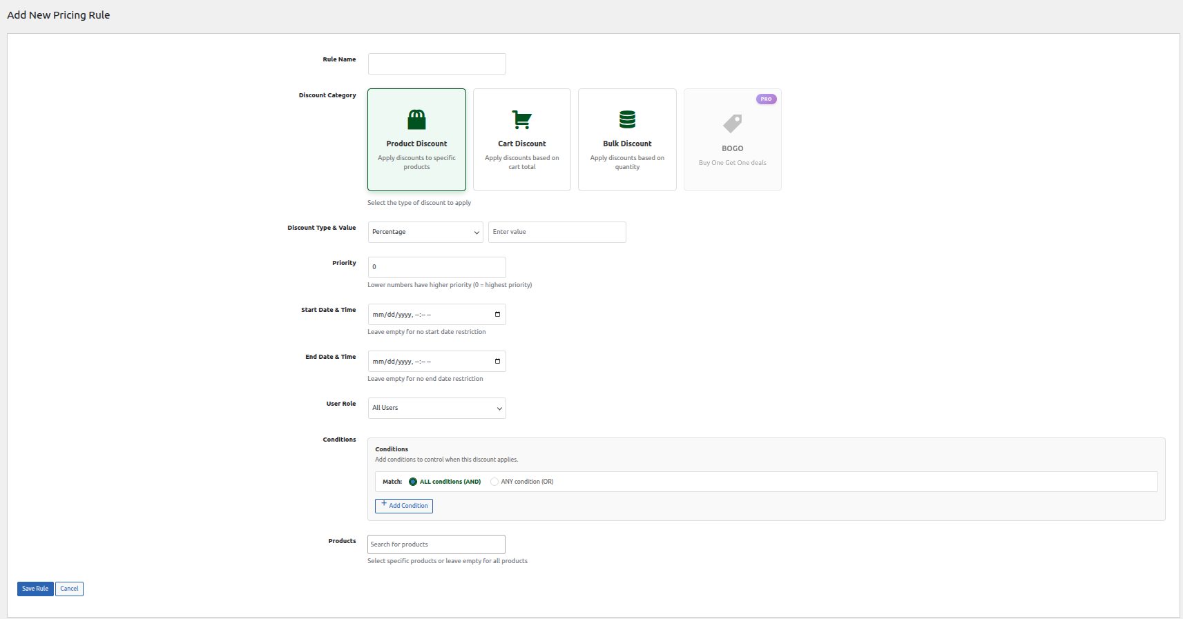 - Discounts based on categories like Product, Cart, and Bulk