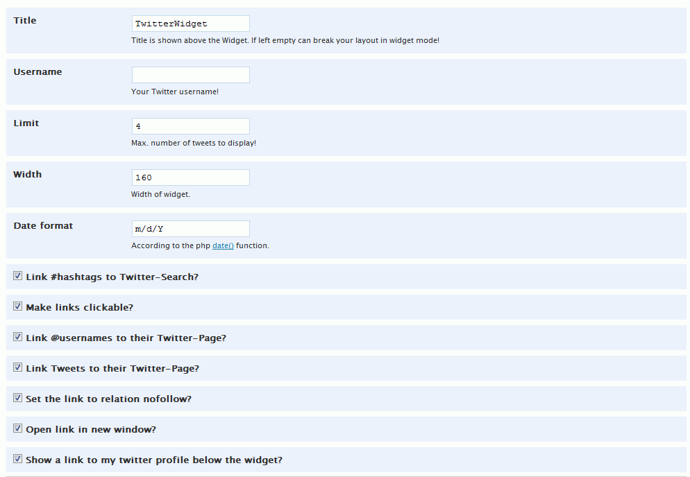 Displays your Twitter timeline in the sidebar of your blog. The plugin is widget ready and comes with many configuration options! Because every theme brings their very special style, Twitterwidget has very little preset css. Please see the css file twitterwidget.css to set collors, borders etc.
