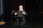 (At rise, Bud stands downstage center with a ratty duffle bag and other tacky “luggage,” including a battered cardboard box which must contain one beautiful candle. Bud is a leftover hippie in his fifties. He sits on his “luggage” and writes a postcard.)