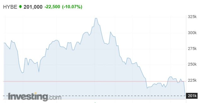 BTSの事務所である「HYBE」の株価は、この記事を執筆していた2022年6月13日、1株20万ウォン(2万円)程度で最高値に比べると3分の2を下回っていた。全世界的な経済不況ではあるが、わずか2ヵ月で32%以上株価が下がったのは、BTSの兵役問題の解決が遅くなっていることに影響されているとの意見が多数だ。
