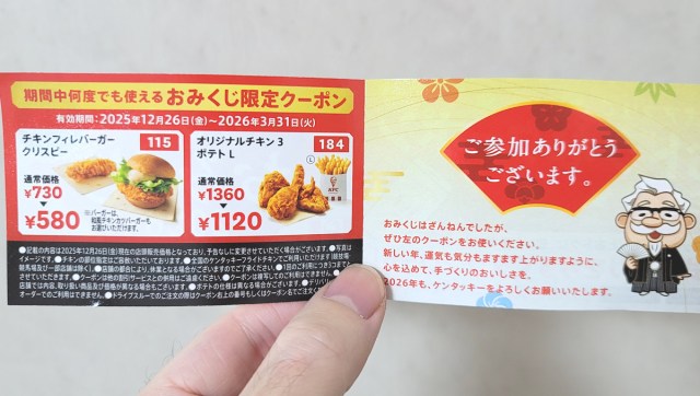 まず「おみくじ」から見ていくと、こちらは運勢に応じて商品の無料券がもらえる仕組みとなっていて、ケンタッキーの福袋ではお馴染みの封入物である。無料券の詳細については公式サイトを確認してほしい。