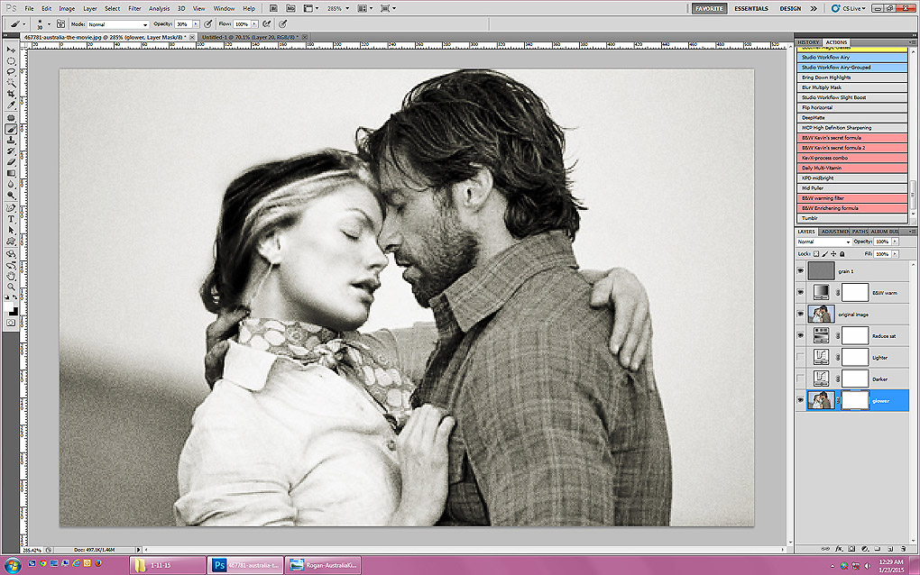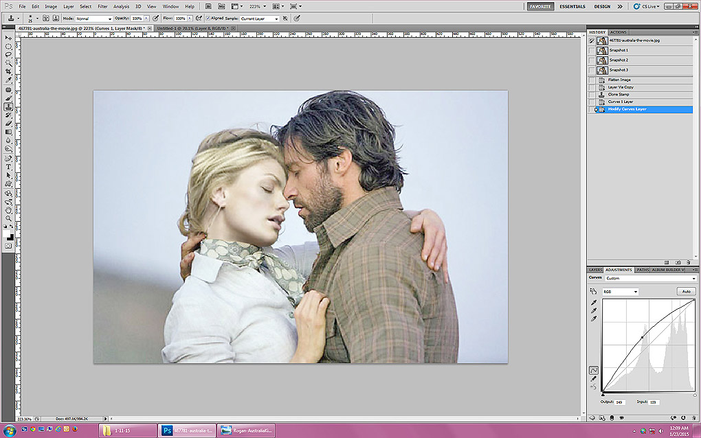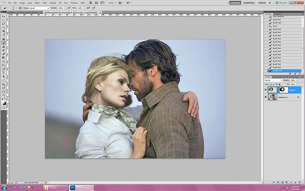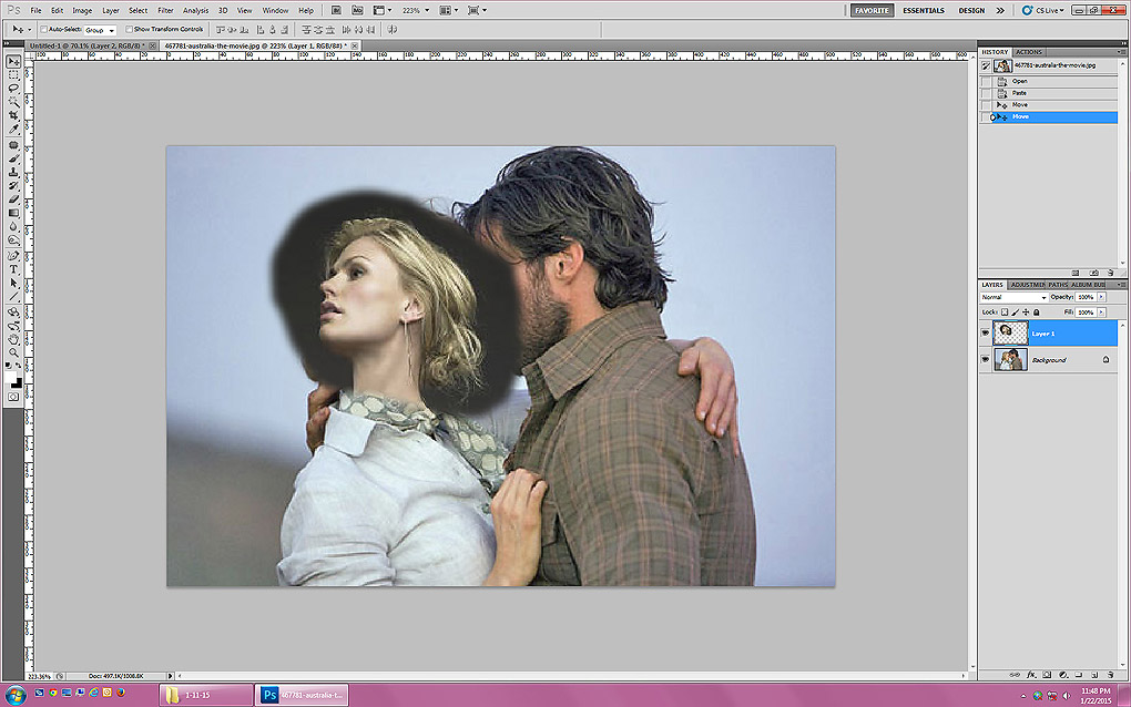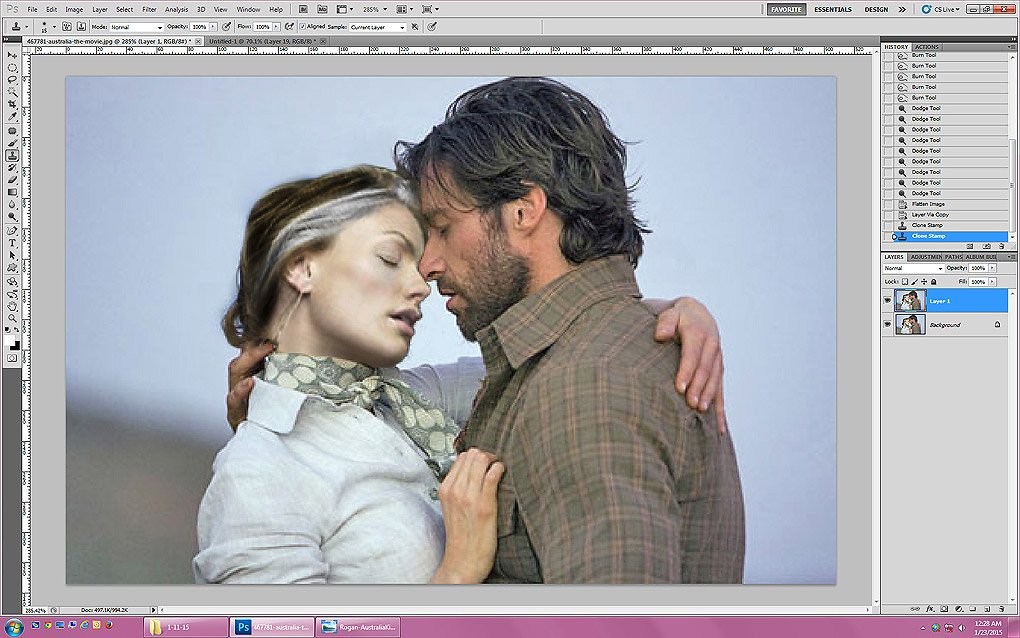 For cschoolgirl, a set of screenshots to show how I made the manip of Logan and Marie in the Outback. I'm not sure how the steps would translate to PS Elements, but as with anything in Photoshop, there are a million ways to do the same thing, so hopefully there's a workaround if you don't have the same tools. I'm not sure what your skill level is, so please ignore me if I explain something that you already understand! Also please excuse any spelling errors; it's 2:30 a.m.! :)