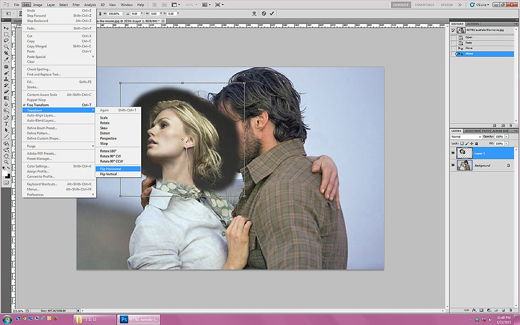 Ctrl+V to paste the selection onto original image. Um, she's facing the wrong way, so we need to fix that.