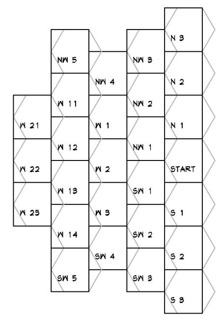 Each contributor’s field will be a rectangle that includes most of a hex, plus a little bit of two adjacent hexes. These will be about 5-1/4″ wide x 6″ high. Finished pieces should be 300 dpi (1558 x 1800 px). If grid is not included in the final art, clearly identify where openings are so next person can make reasonable connections. If the final scan is oversized, provide clear crop marks.