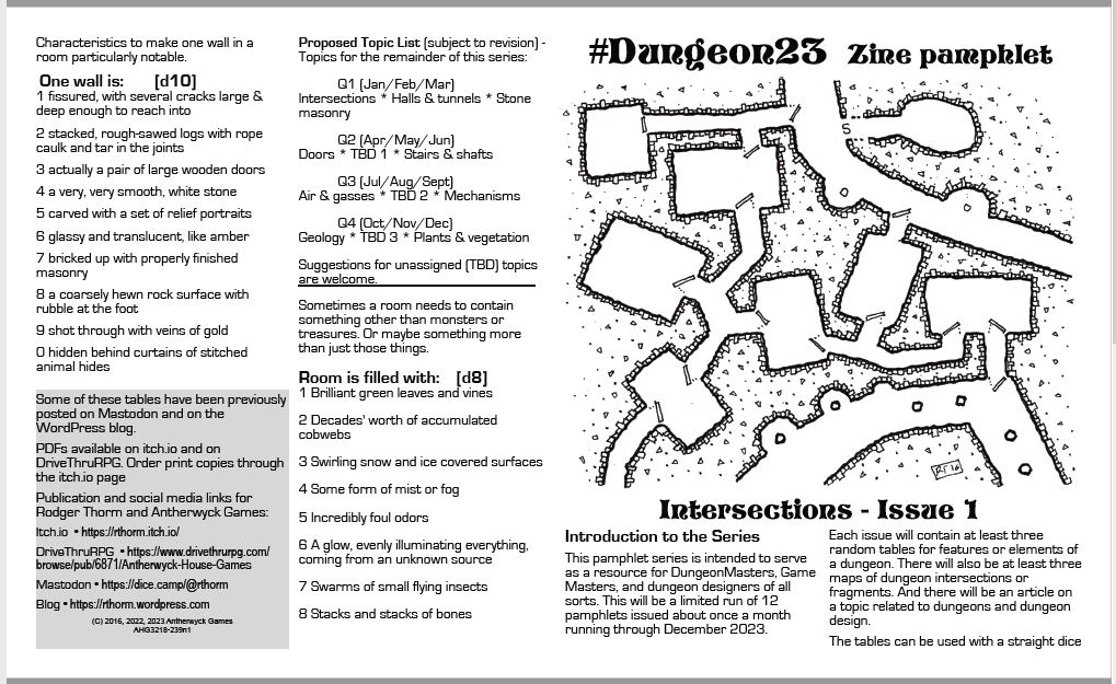 The first issue is now available at DriveThruRPG. There will be an issue per month for 2023. The pamphlet is just a single legal-size (8-1/2″ x 14″) sheet folded in quarters, but packed with information. Each issue will contain at least three random tables for features or elements of a dungeon. There will also be at least three maps of dungeon intersections or fragments. And there will be an article on a topic related to dungeons and dungeon design.
