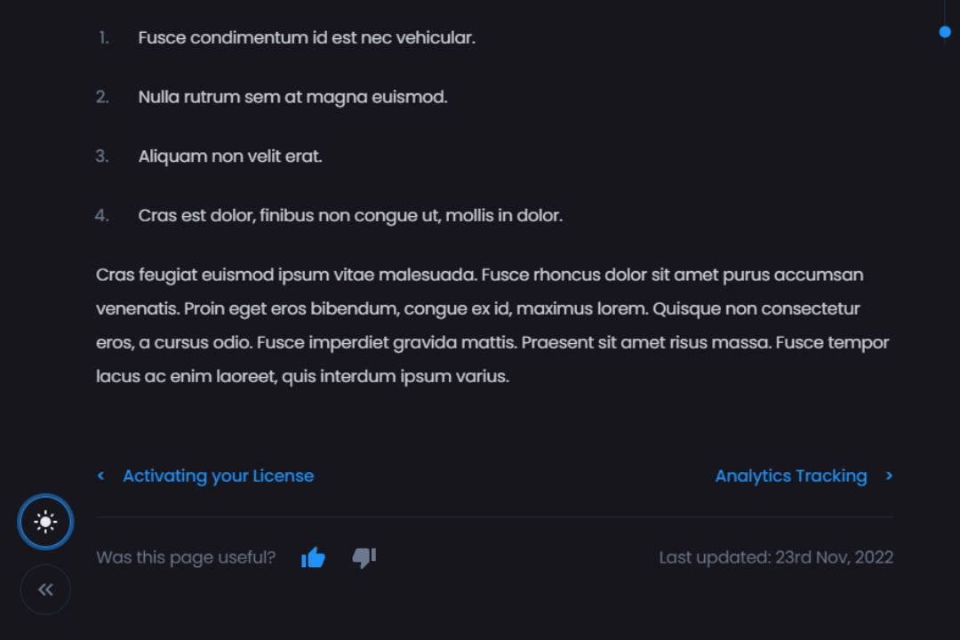 Connect your pages with a toggleable sidebar menu to navigate across your documentation. The menu can be specified per page, per topic or across all documentation easily with our inherited sidebar system.