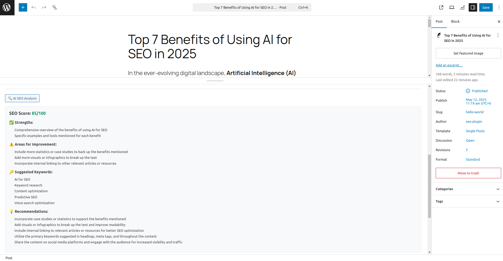 5. Click «🔍 AI SEO Analysis» for detailed content analysis and recommendations
