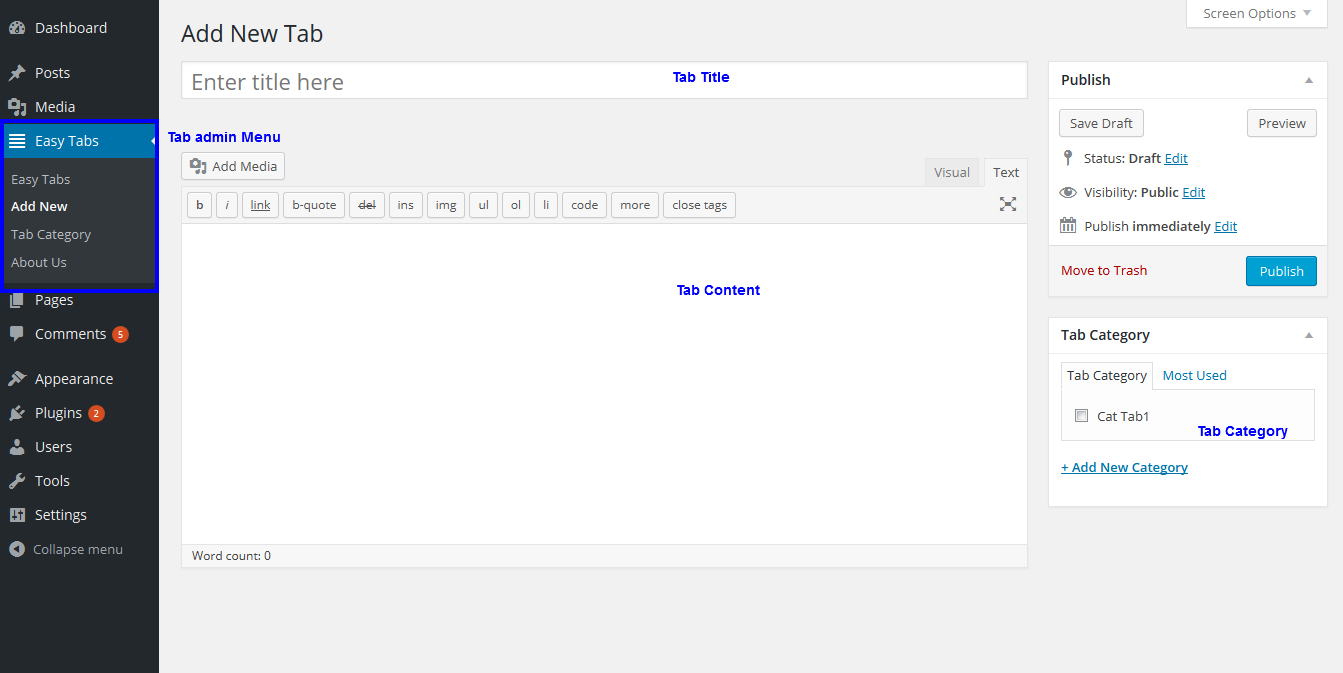 - Go to Wp-admin-> Easy Tabs ->Add New , here we can add tab items.