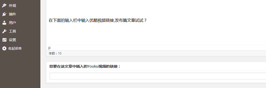 - 可以在编辑器下方输入优酷视频链接就直接在文章/页面显示优酷视频