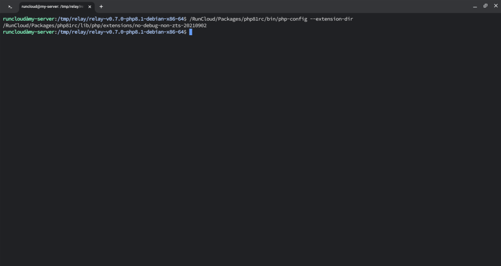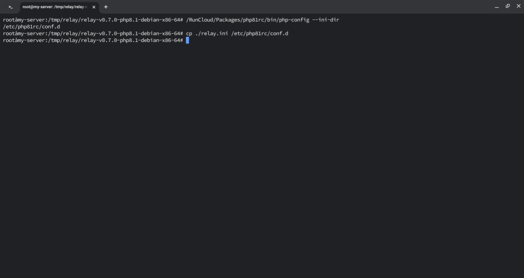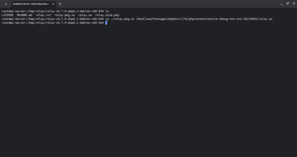 - Copy the Relay package: The output of the previous command gave us the location of the extensions directory. Now we will use the cp command to copy the Relay package to the PHP extensions directory.