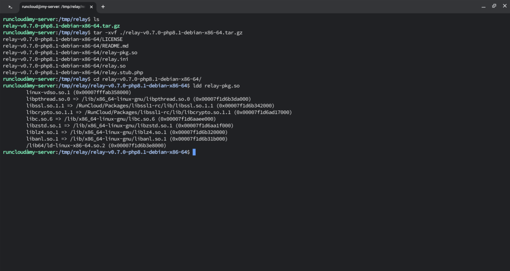 tar -xvf ./relay-v0.7.0-php8.1-debian-x86-64.tar.gzIn the above command, replace relay-v0.7.0-php8.1-debian-x86-64.tar.gz with the name of your file.