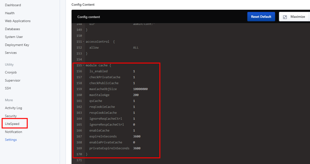 After editing the module cache block, save the changes and restart the OpenLiteSpeed server.
