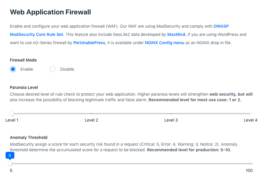 You can easily enable or disable ModSecurity WAF to each web application in your RunCloud servers and adjust Paranoia Level and Anomaly Threshold parameters.