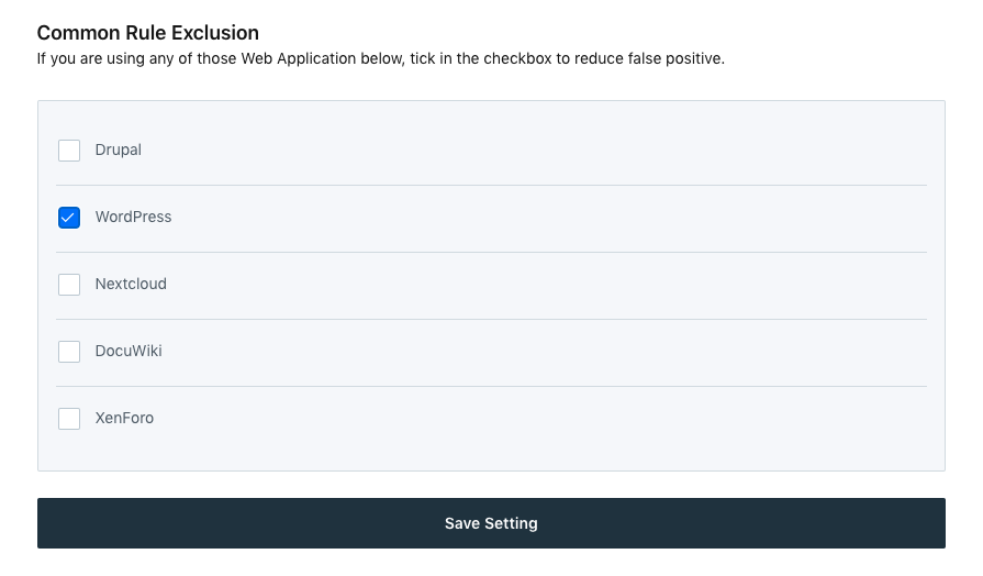 If your current web application uses any of those CMS, please tick in the checkbox to reduce false positives and it will be automatically applied to your firewall.
