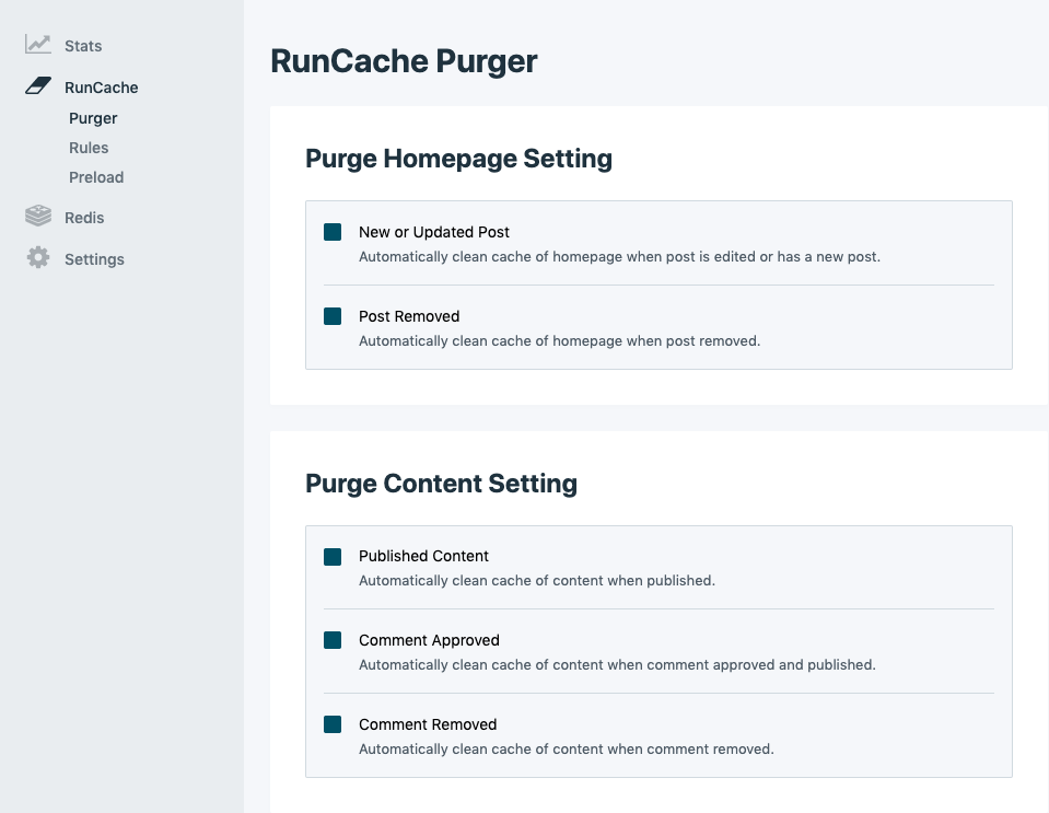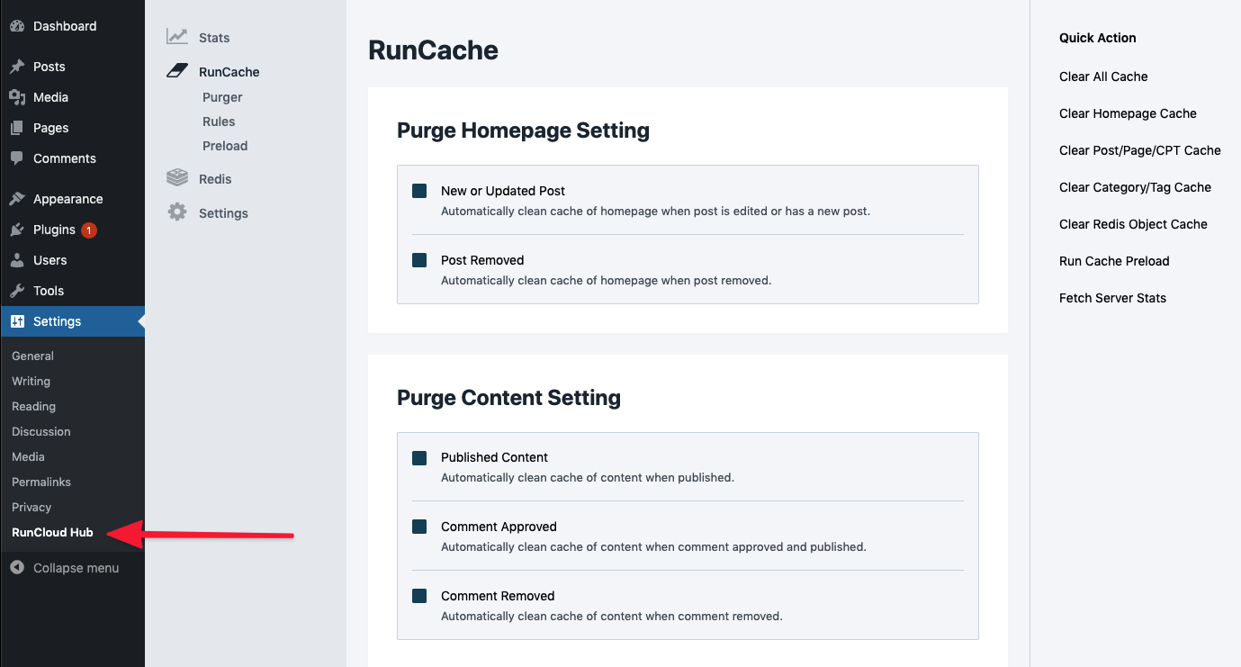 RunCloud Hub is a hub for all RunCloud plugins for WordPress. It is not only for NGINX FastCGI Cache (RunCache), but also Redis Object Cache and Server Health & Transfer Stats monitoring directly from your WordPress dashboard.