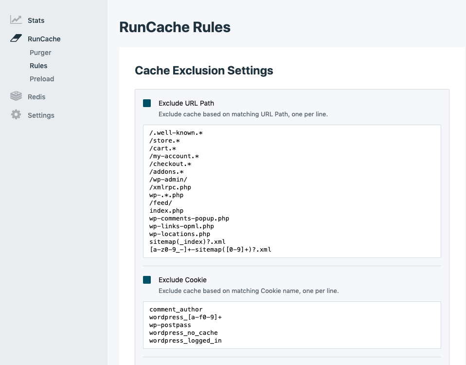 Rules settings allow you to control Cache Exclusion.
