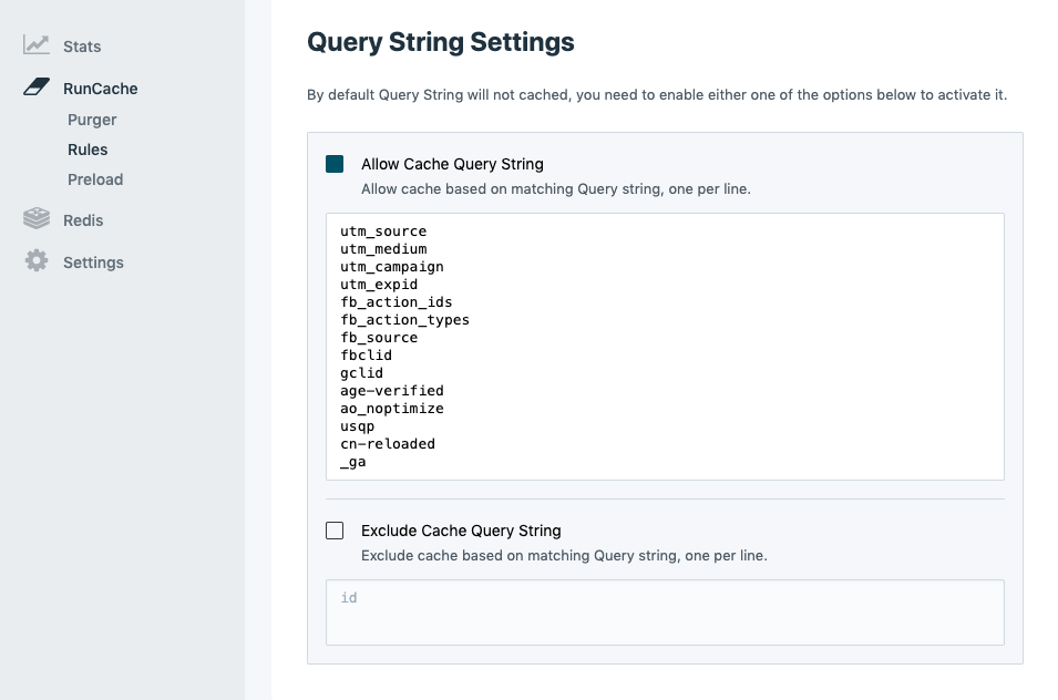 RunCache also has dedicated settings for query strings, because query strings will not cache by default.