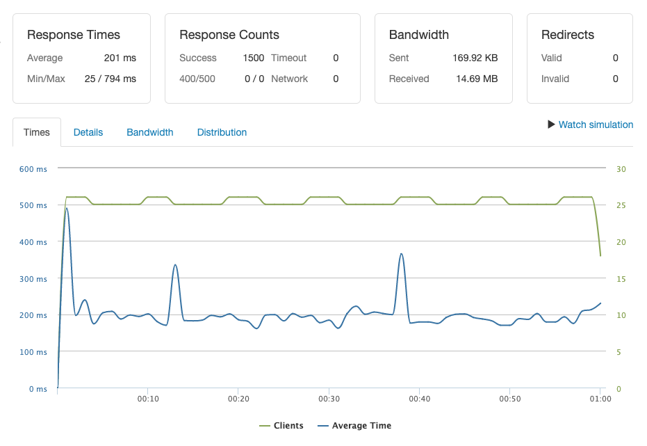 For this test we use Loader.io to send from 0 concurrent user and increasing to 100 concurrent users within 1 minute.