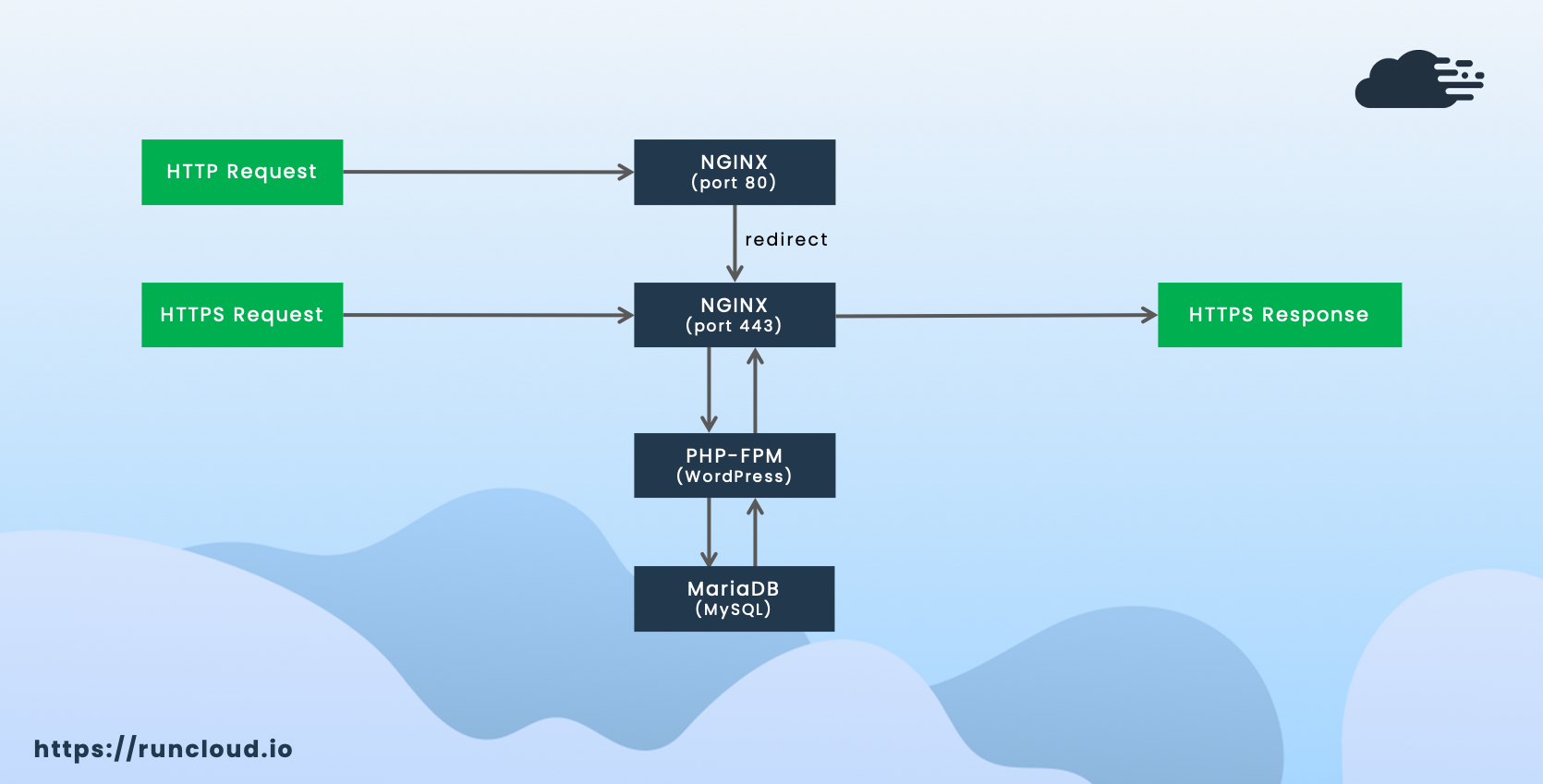 - When a user visits your WordPress page, the web browser sends an HTTP/HTTPS request to NGINX.