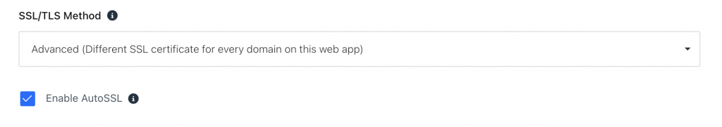 The new option to select SSL/TLS Encryption methods has two modes. Advanced and Basic. The advanced mode issues a different SSL certificate for every domain added to this web application while when set to basic, a single SSL certificate is issued and used for every single domain on this web application.