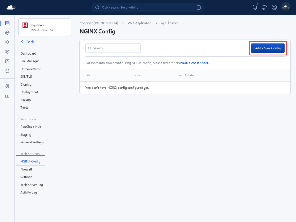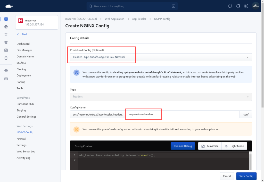 - Go to your RunCloud dashboard and select the web application that you want to add custom headers to. Click on the “Nginx Config” in the left menu to open the Custom Nginx Config section.