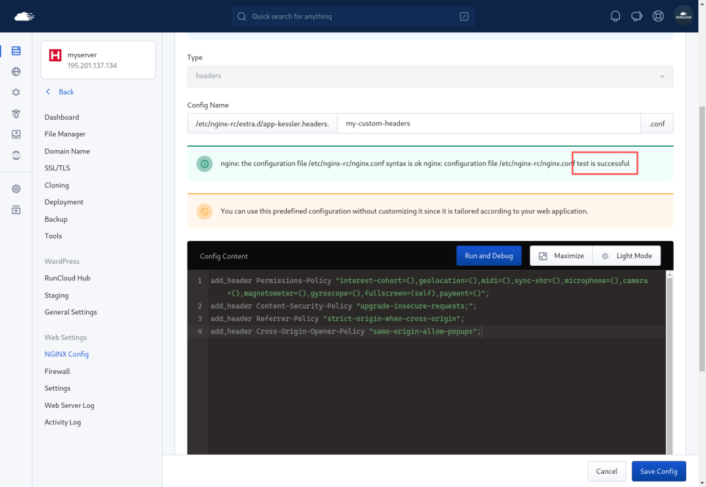 add_header Cross-Origin-Opener-Policy "same-origin-allow-popups";- Once you have added all the headers, click on the “Run and Debug” button to test the configuration. If the config doesn’t have any syntax errors, you will get a message saying “test is successful”.