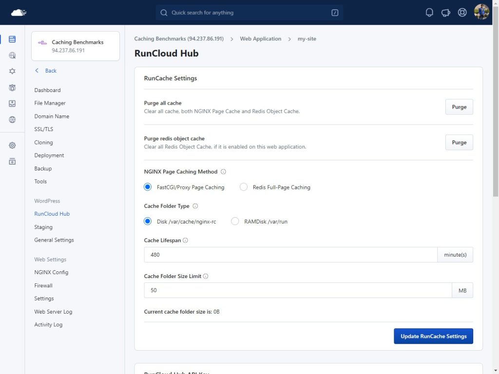 The RunCloud Hub plugin provides users with a range of options for configuring and optimizing their website’s caching, including the ability to purge all cache, purge specific pages or content, schedule automatic cache purges, and manage the Redis Object Cache.