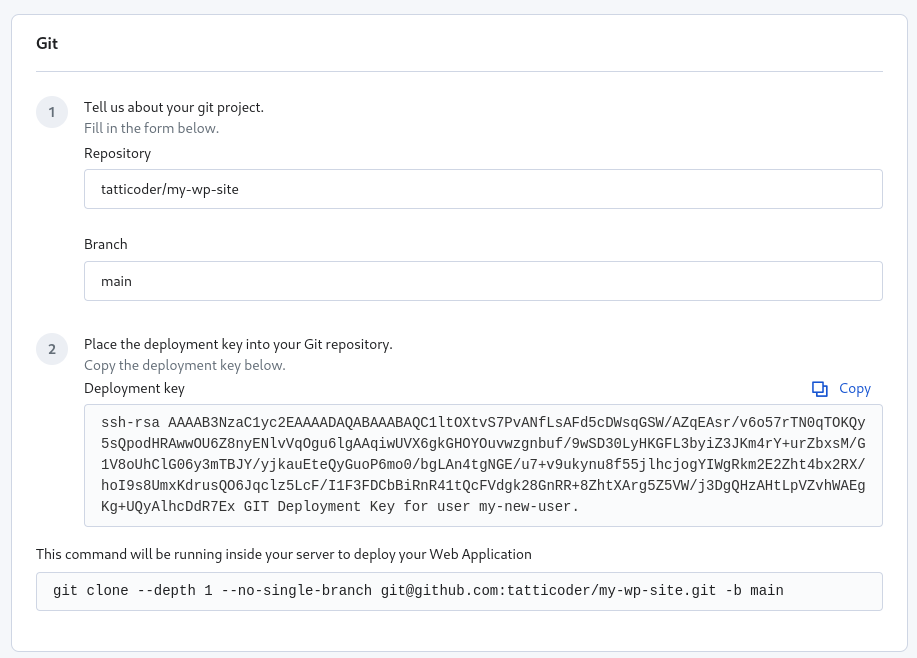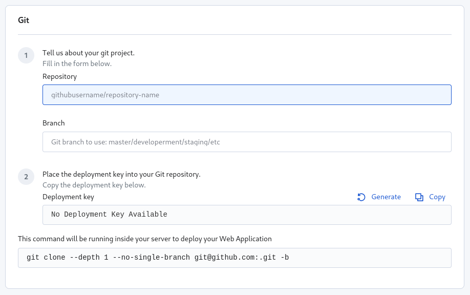 First, click on “Generate” to create a new Deployment key, and then click on “Copy” to copy it to your clipboard.