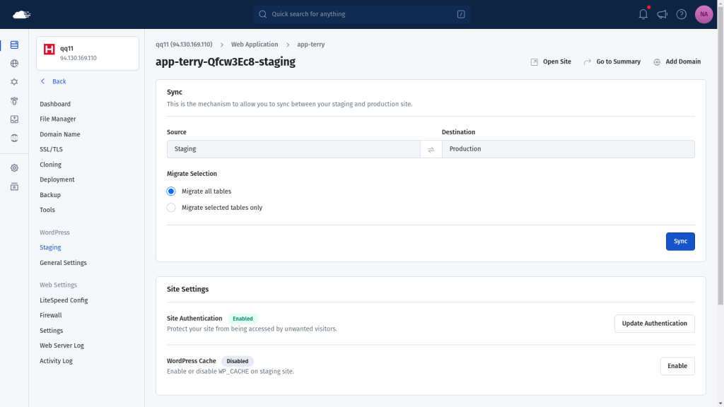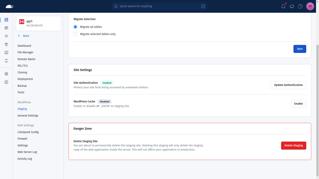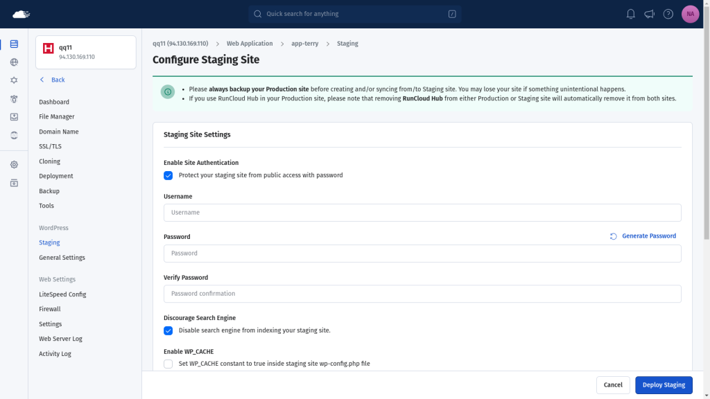 If you no longer need your staging environment, you can delete it easily. You can do this from the “Staging” menu or from the web application list on RunCloud. Deleting your staging site will not affect your live site.