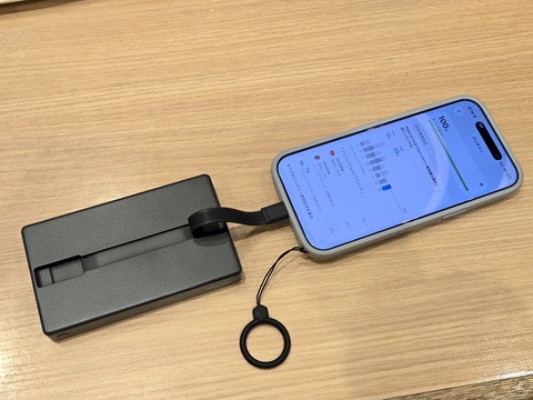 cheero Solido 10000mAhで実際に充電を行ってみましたが、内蔵ケーブルにて愛用している「iPhone Air」を急速充電できました。また3台同時充電も行ってみました。なお、3台同時に充電する場合は合計出力が最大15Wとなるため、内蔵ケーブルで接続した「Galaxy Z Fold6」は急速充電の表示が出ましたが、USB Type-C端子に接続したiPhone Airは低速充電の表示となりました。