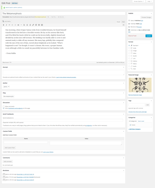 A post editing screen with all sorts of meta boxes turned on. A somewhat cluttered view, potentially distracting your editors, and overwhelming new users.