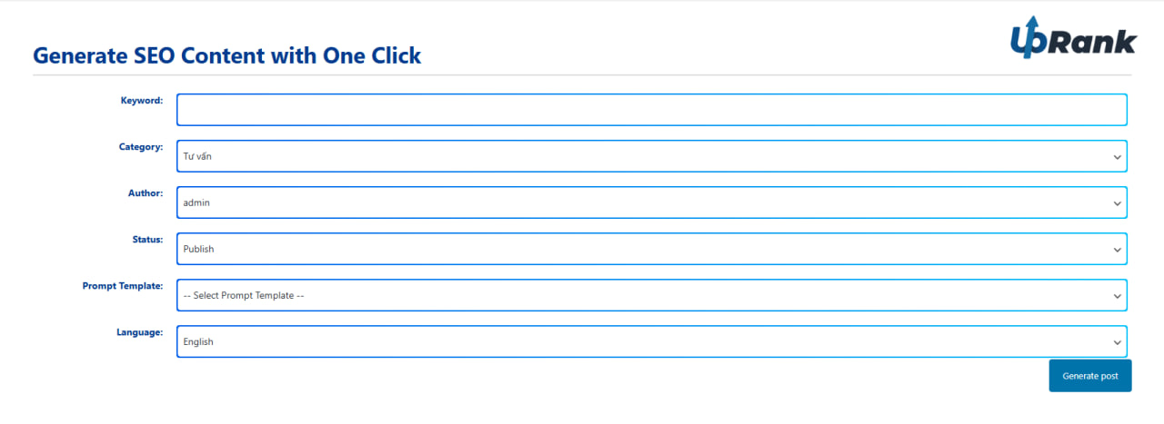 Go to UR Content AI > Generate Post. Enter your keyword, select a prompt template, and click Generate Article. The article will be created and displayed.